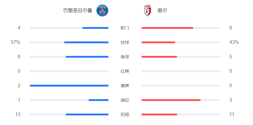 本场比赛,内马尔伤愈复出,搭档伊卡尔迪、迪马利亚首发,姆巴佩、卡瓦尼替补待命。第2分钟,里尔率先来了个下马威,切利克大禁区前沿右侧巧妙斜塞,杰卡禁区中路背身拿球,随后斜着带了两步后右脚勾射,纳瓦斯倒地用指尖将球挡出。第9分钟,里尔再度制造威胁,曼达瓦左路下地传中,安达尔甩头攻门稍稍偏出。