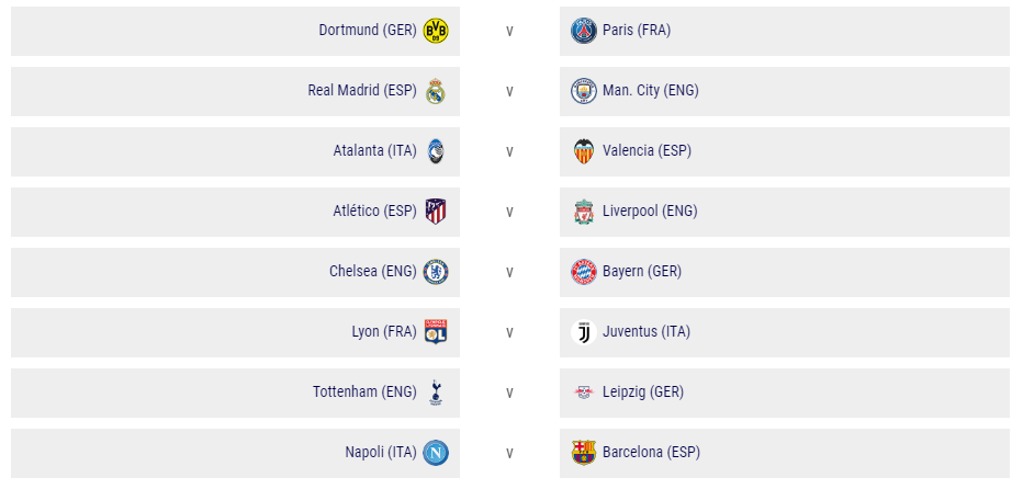 非种子球队为:皇家马德里(西甲)、托特纳姆热刺(英超)、亚特兰大(意甲)、马德里竞技(西甲)、那不勒斯(意甲)、多特蒙德(德甲)、里昂(法甲)、切尔西(英超)